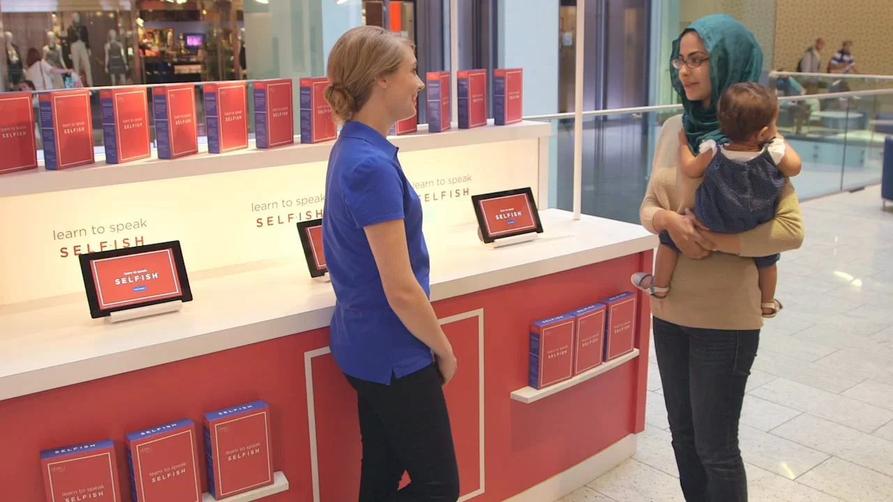 We built a kiosk to teach mom’s a language they might find foreign: Selfish. We placed this kiosk in a local mall and watched moms react to our various Selfish phrases as they realized they needed to get good at this language for themselves and for their family.